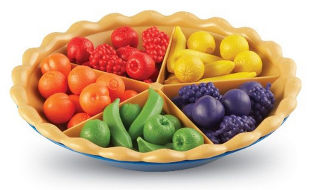 - Includes 60 counters (7 fruits in 5 different colors), durable plastic pie, removable divider, 3 double-sided sorting cards, 2 jumbo tweezers and activity guide