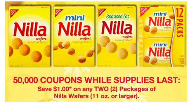 Hurry and grab your coupon valid for $1 off any 2 Packages of Nilla Wafers! This is for the first 50,000 so don’t delay!