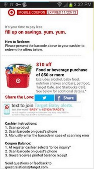 Text FOOD to 827438 to get your $10 off $50 Food or Beverage purchase at Target